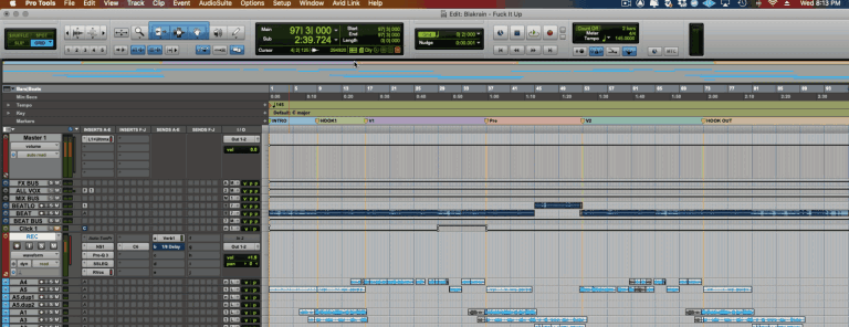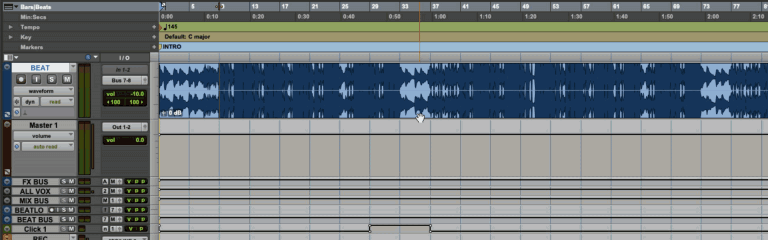 In my template I have a dedicated track for the beat that is turned down -10db. Most of the time the beats that the artist will bring in are mastered or limited already and super loud. You don’t want to fight this by turning the vocal tracks up or you’ll be clipping the mix bus in no time. Give yourself some headroom!