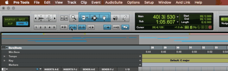 This is super helpful with working through a section with the timeline / edit selection unlinked. Since you can’t move the transport with your cursor, use number pad 1 & 2 to move the transport forwards or backwards by 1 bar.